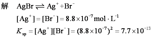 由难溶电解质的溶解度可求Ksp。 例1 室温时AgBr的溶解度为8.8×10-7mol·L-1,求AgBr的溶度积常数。