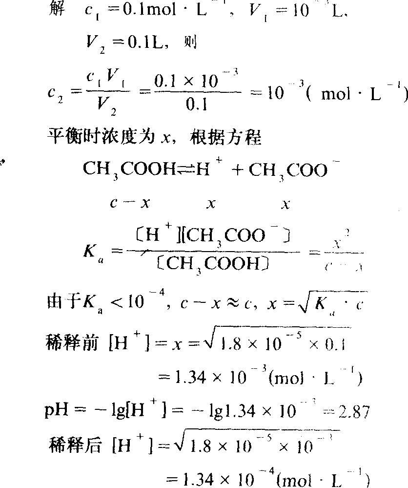 式中c1,c2分别表示浓溶液和稀溶液的浓度(mol/L);V1,V2分别表示浓溶液和稀溶液的体积(L)。对强电解质溶液求出稀溶液的浓度,便知其H+浓度,即可计算pH值。弱电解质溶液稀释后电离度增加,必须用电离常数与浓度、电离度的关系计算H+浓度,然后求其pH值。 例 1 取pH1=3盐酸溶液 1mL,加水稀释至100mL,求稀盐酸的pH2值。
