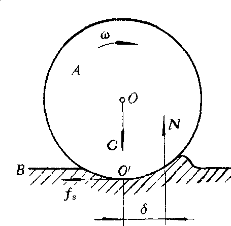 如果物体A不受其它驱动力或驱动力矩的作用,转动角速度逐渐减小,直至静止。在这一过程中,物体A受重力G,静摩擦力fs,还由于B表面在A重力作用下被压缩向下发生形变,物体A向前滚动时,受B表面弹力N作用,其作用点相对过A质心垂线与B表面交点O′向前移动δ距离(如图)交点O′可视为瞬时转动中心。重力G,静摩擦力fs对O′点力矩为零,弹力N对O′点力矩为Nδ,方向与转动方向相反。此力矩阻碍物体转动,通常称其为滚动摩擦力,其实质是滚动摩擦力矩。记为M=δN,其中δ称为滚动摩擦系数,具有长度量纲,它与两物体接触材料和接触面的物理状态有关。所谓滚动摩擦比滑动摩擦小,不能理解为滚动摩擦力矩比滑动摩擦力小,因为力矩跟力无法比较大小。正确的理解是,在其他条件相同的情况下,克服滚动摩擦的力矩使物体滚动所需作用在滚动物体质心上的水平力,比克服滑动摩擦力所需要的力小得多。两者之比约为1/60-1/40。所以,在高速转动的机器上,采用滚动摩擦能减少机械能的损失。物体之间或车辆在道路上进行滚动运动的滚动摩擦系数(单位为米)如下表。