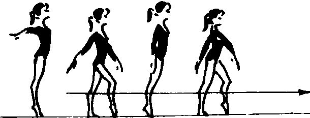 动作要领: 两腿经提踵过程交替移重心进行两脚的向前滚动,膝向前,小腿与地面垂直,上体保持正直,收腹立腰,髋上提,臀部不能后坐,两臂自然前后摆动。 教学重点 用不同节奏体会动作要领。然后从原地滚动步开始再行进间做向前、向后的滚动步,逐步过渡到有腾空的滚动跑。 |