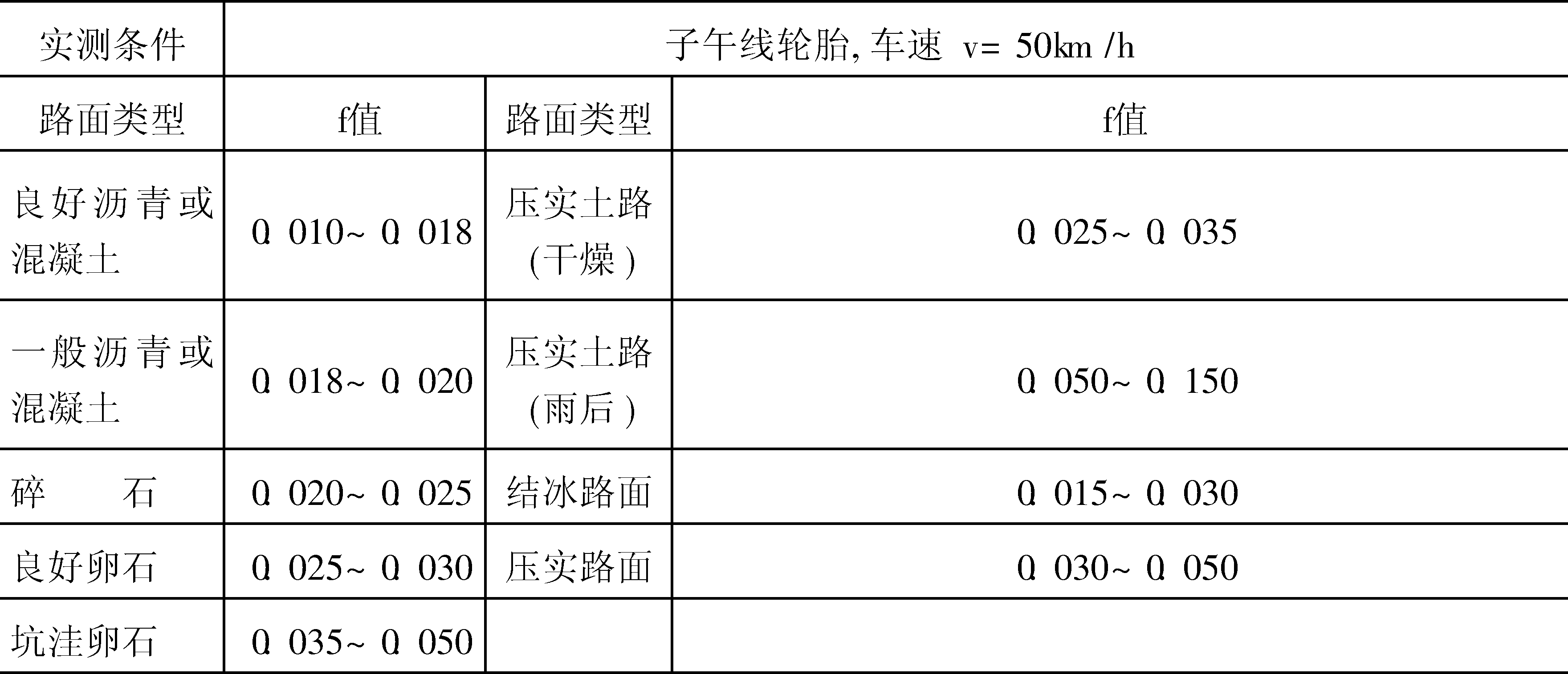 | 释义 | 滚动阻力rolling resistance汽车行驶时,阻抗车轮滚动的力。车轮与支承路面在接触区域产生的切向作用力和法向作用力使弹性轮胎与路面产生变形而形成的阻力。常用符号Ff表示。Ff与车轮载荷W、轮胎结构、路面状态有关。一般定义为:Ff=fW,这里f称为滚动阻力系数,其值由试验测定。用子午线轮胎时f值较用斜交线轮胎时f值小;轮胎气压高时f值较轮胎气压低时f值小;在混凝土路面上f值较在碎石路面上f值小;低速行驶时f值较高速行驶时f值小;车速愈高,f值增长愈快,但车速v低于50km/h,f值变化不大,有时可用公式f=0.0116+0.000142v粗略计算之。一般在良好混凝土路面上行驶,车速v≤50km/h时,选用f=0.0165;车速v>50km/h时,常用实测的f值作参考。下表列出了道路状况与滚动阻力系数f值(实测)的关系。 道路状况与滚动阻力系数f值(实测)