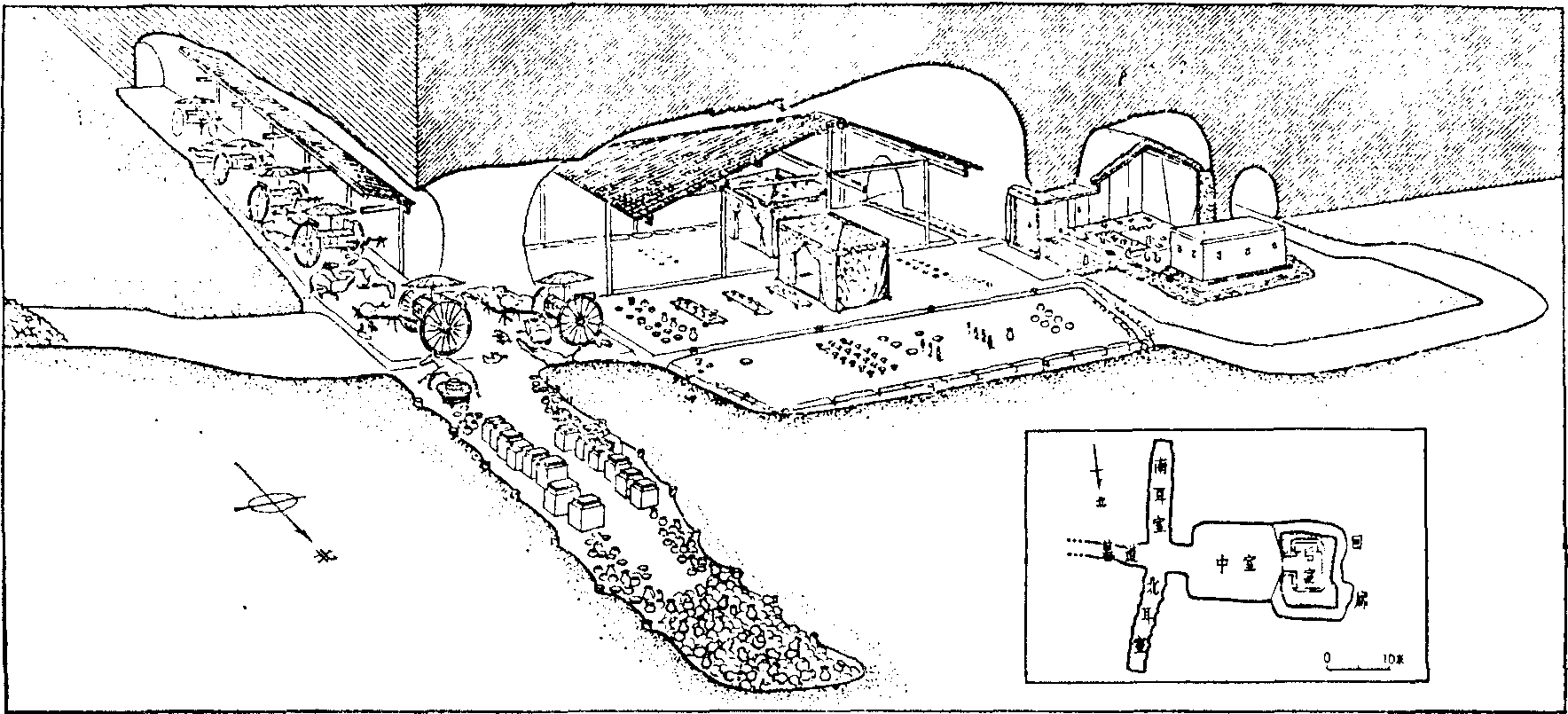 刘胜墓墓室内部 满城汉墓西汉中山靖王刘胜墓及王后窦绾墓。位于河北省满城县西南陵山上。于1968年发掘。两墓并列开凿在山岩中,为规模宏大的崖洞墓。刘胜墓全长五十一点七米,窦绾墓全长四十九点七米。两墓的形制和结构相似,均分为墓道、甬道、南耳室、北耳室、中室和后室六部分。中室和后室之间装有石门,墓道口先用土坯或砖砌筑,再浇灌铁水铸成铁门。刘胜墓的甬道、南北耳室和中室,窦绾墓的中室,均建有瓦顶木构房屋。两墓后室则是在洞内用石板筑成石屋。墓内各室分门别类地放置随葬品。刘胜墓的南耳室象征车马厩,放置车六辆,马十六匹,狗十一只,鹿一只。北耳室象征仓厨、磨房,放置大量陶器,还有石磨和推磨的牲畜遗骸。中室模拟饮宴待客的厅堂,中部张设两具帷帐,四周摆满了鼎、釜、甗、钟、罍、壶、 𫔴、盆、灯、熏炉等大量铜器,各种铁器、金银器、漆器、玉石器、料器、陶器和五铢钱、侍从俑等。还有象征出行时用的小型偶车马仪仗。后室象征卧室,除放置棺椁外,还有许多精美的铜器、漆器、玉器及兵器、五铢钱、金饼、侍从石俑等。附属于后室的小侧室象征浴室,内置盆、罍、灯、熏炉等铜器,还有一块搓澡石和一个石男仆俑。整个墓室完全模拟墓主生前所居宫室。窦绾墓内布置情况与刘胜墓大体相似,只是随葬品数量略少。刘胜墓葬具为一椁一棺,髹漆棺椁置于后室内汉白玉石的棺床上。窦绾墓葬具只有一镶玉漆棺,漆棺内壁用一百九十二块玉版镶嵌,外壁镶嵌玉璧二十六块。刘胜和窦绾均以金缕玉衣作为殓服。刘胜的玉衣由二千四百九十八块玉片组成,所用金丝约一千一百克;窦绾的玉衣由二千一百六十块玉片组成,所用金丝约七百克。两墓随葬品非常丰富,共有四千二百多件。其中最为精美的是铜器,如鎏金银镶嵌乳钉纹壶、鎏金银蟠龙纹壶、错金银鸟篆文壶、错金博山炉、鎏金“长信宫”灯、错金嵌绿松石朱雀衔环杯等,均属汉代青铜工艺之精华。在经过分析检验的部分铁器中,有低碳钢、中碳钢和百炼钢制品,还有固体脱碳钢制品。另外,还出土了用于针灸的金、银医针和用于计时的铜漏壶等。由于这两座墓规模巨大,保存完整,年代明确,并首次出土了完整的金缕玉衣,不仅为研究汉代诸侯王贵族的丧葬制度有重要价值,而且为研究汉代的冶炼、铸造、制玉、漆器、纺织等手工业和工艺美术发展情况提供了重要资料。 满城汉墓西汉中山靖王刘胜及其妻窦绾墓。位于河北省满城县陵山上,1968年发掘。该两座墓建在陵山主峰靠近山顶处,为南北并列的夫妇并穴合葬墓。墓室在山崖中开凿出来,墓口以土坯或砖砌筑,再以铁汁浇灌封门。两墓共出土文物4200多件,种类有陶器、铜器、铁器、金银器等。铜器“长信宫”灯是汉代罕见的艺术珍品。其造型为宫女跪坐持灯状,通体鎏金,有可转动的灯盘和可以开合的灯罩,能调整灯光的射向和强弱。墓葬中还出土了两套完整的金缕玉衣,这是中国有准确纪年的最早的玉衣。 |