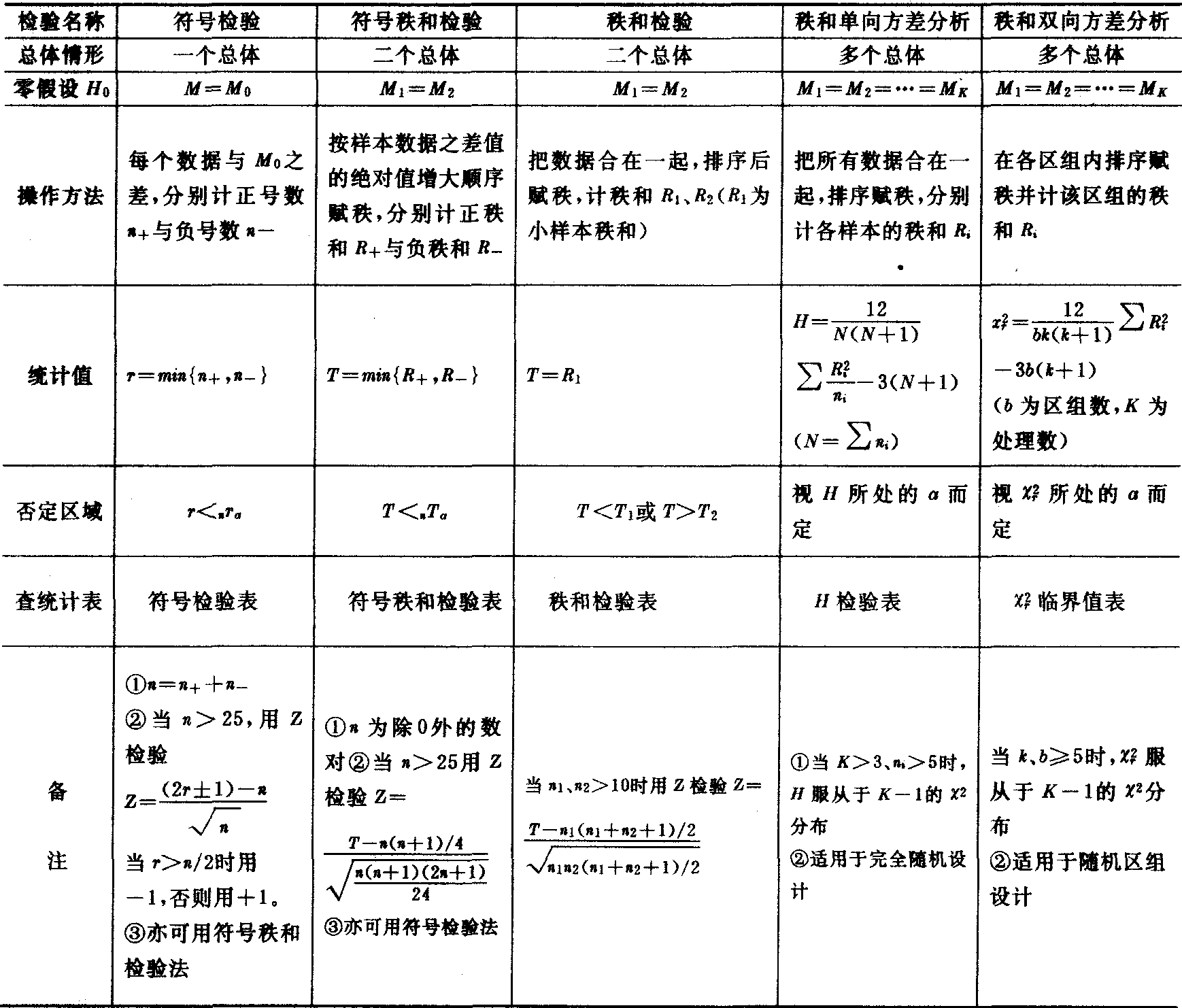 | 释义 | 中位数检验zhongweishu jianyan指通过对总体中位数的假设检验来比较样本相应的总体分布有无明显的差别。若中位数相同(H0),则视为总体分布相同、两样本之间无明显差异;若拒绝H0,则视为相反。中位数检验可包括符号检验(比较一个样本的数据与中位数之差的符号或比较两个样本的数据之差的符号来检验H0)、符号秩和检验(比较两个样本的正秩和与负秩和来检验H0)、秩和检验(比较小样本的秩和来检验H0)、秩和的单向方差分析和双向方差分析(比较多个样本的秩和来检验H0)等。兹把它们列表如下,以利对照、查阅。 关于中位数的检验一览表