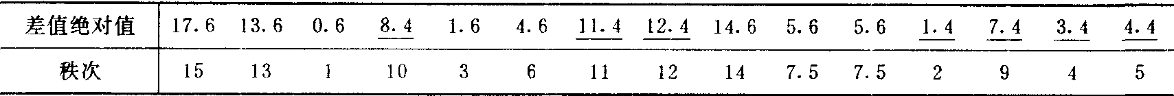 〔例1〕 某校对年满17~18岁的女生进行脉搏数的测定,随机抽取15名女生的测定结果如下。问该校女生的脉搏数与全国该年龄组的脉搏数80.4有无明显的差异? 98 94 81 72 82 85 69 68 95 86 8679 73 77 76 立H0:M=80.4。先用“符号检验”法。把每个数据减80.4,得差数为: 17.6 13.6 0.6 -8.4 1.6 4.6 -11.4-12.4 14.6 5.6 5.6 -1.4 -7.4 -3.4-4.4 则n+=8,n-=7 n=8+7=15,故统计值r=min{n+,n-}=7。据n及a=0.05,查符号检验表得15γ0.05=3。由r>15γ0.05,故接受H0。 若用“符号秩和检验”法,则按差值的绝对值增大的顺序赋秩(下面加划线者为负秩)为: