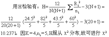 ![]() (6.52+192+10.52+142)-3×5(4+1)=10.14;由f=K-1=3及a=0.05查X2分布表得X2(3)0.05=7.815。因X2>X2(3)0.05.故拒绝H0。 中位数检验一种两样本齐一性检验。检验统计量基于联合样本的中位数。假设有两个相互独立的简单随机样本x1…xm和y1…yn,其中N=m+n充分大。常被应用于测验分数统计中。 |