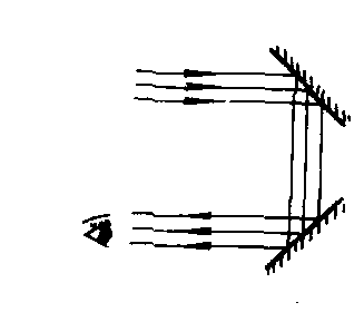 潜望镜Qianwangjing在隐蔽处所观察外界情况时常用的光学仪器。最简单的潜望镜用两块与观察方向成45°角的平面镜制成,如图所示。来自远方的光线被上下两平面镜反射,而被观察者看到。在潜水艇、坑道和坦克内常应用潜望镜来侦察敌情。