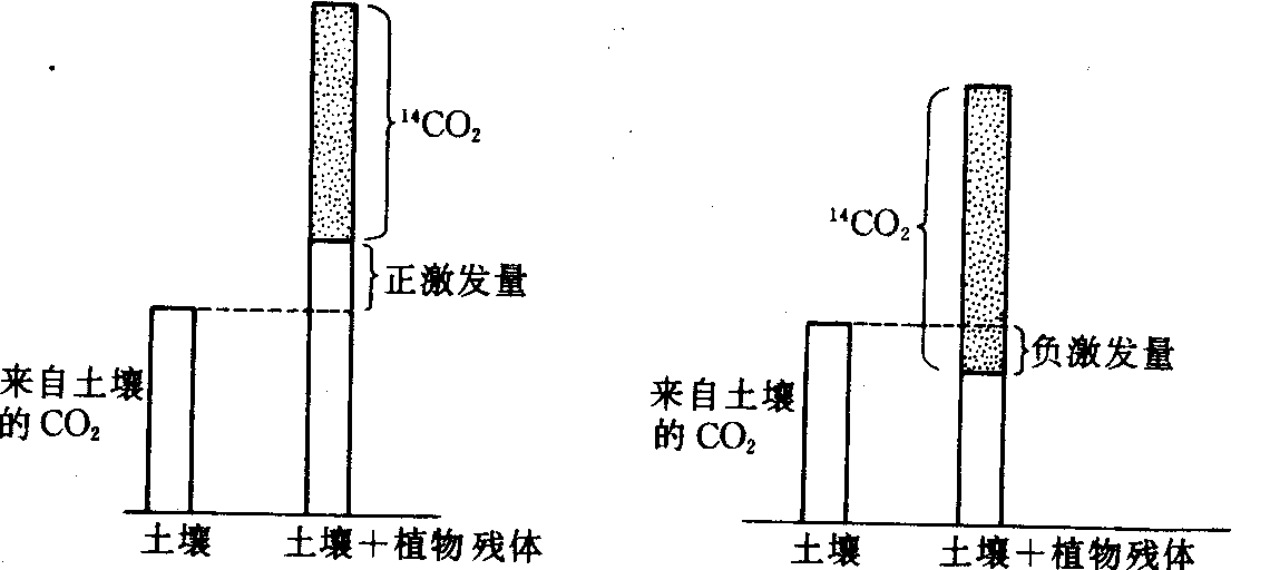 产生表观正激发效应的原因有: 在石灰性土壤中,加入的有机物质分解时释出的CO2-14C与土壤原有的非标记碳酸盐-12C之间发生了置换作用。