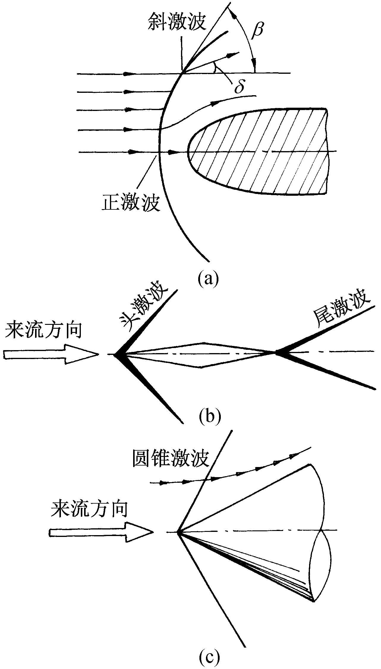 | 释义 | 激波即“冲击波”。 激波shock wave又称“冲波”。超音速气体流动中一个十分薄的区域。通过该区时,气流的速度、压强、温度、密度都发生急剧变化。分正激波(离体激波)和斜激波。超音速气流流过正激波后,速度突变为亚音速,但流动方向不变,压强、温度、密度皆急剧增高;流过斜激波后,速度降低但仍为超音速,流动方向与物面平行,压强、温度、密度也急剧增高,但比正激波弱。正激波或斜激波的产生,取决于超音速流动马赫数的大小和物体头部的形状。通常钝头产生离体激波(图a),尖头产生斜激波(菱形物体前缘)(图b)或圆锥激波(圆锥体物体)(图c)。激波的存在使运动物体承受极大的空气阻力。此外,激波与机翼、机身表面气流的相互作用,易引起气流分离,当分离气流流过尾翼时,会降低飞机的操纵性。所以在超音速和高亚音速(在部分区域出现超音速流动)飞机设计中,如何避免激波或减弱激波强度,已成为空气动力研究的重要内容。目前,使用的高亚音速喷气机的机翼都应用了这方面的研究成果,如超临界机翼等。