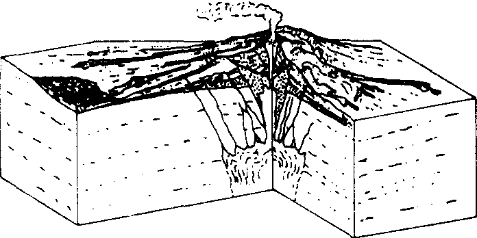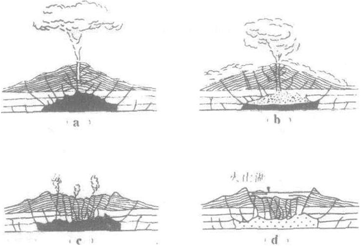 图3 火山口的演化 (a)、(b)火山喷发后,使下部岩浆减少,形成空洞 (c)下部失去支撑,引起上部崩塌,形成破火口 (d)在破火口中积水成湖。 |