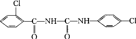| 释义 | 灭幼脲Ⅲ又称苏脲1号。化学名称:1-邻氯苯甲酰基-3-(4-氯苯基)脲。化学结构式如下。原粉为白色结晶,熔点199~201℃,不溶于水,在丙酮中溶解度10 g/L。加工制剂是25%悬浮剂,每公顷用0.45~0.6kg防治各种鳞翅目初龄幼虫。大鼠急性口服LD50>20 000 mg/kg,小鼠与大鼠相同。动物试验无积蓄毒性,也无致突变、致畸作用、大鼠经口无作用剂量为125 mg/(kg·d)。