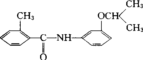 | 释义 | 灭锈胺mepronil又称担菌宁。酰胺类杀菌剂。化学名称:3-异丙氧基-2-甲基苯酰替苯胺。化学结构式如下。原药白色结晶,20℃时水中溶解度12.7 mg/kg,易溶于有机溶剂。在水中或pH5~9的弱酸、弱碱液中稳定,对光、热稳定,1981年日本组合化学工业公司开发。为选择性杀菌剂,对担子菌有特效,如水稻纹枯病、小麦锈病、梨锈病、棉立枯病、马铃薯菌核病等。通过种子处理,土壤处理,叶面喷洒,可抑制菌核萌芽、侵入菌丝块的形成、菌丝伸长,病斑扩大。有较长的残效,还可用于工业上防霉杀菌。如木材防腐,鱼网处理等,对植物安全,对大鼠急性口服LD50>10 000 mg/kg,经皮LD50>10 000 mg/kg,对兔眼黏膜无刺激,鲤鱼TLM(48 h)8.6mg/kg。