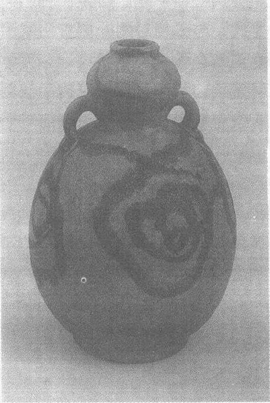 | 释义 | 灰釉黑彩葫芦瓷瓶唐。高24.6厘米,口径3.5厘米。山东省青岛市博物馆藏。此瓶小口,厚唇,瓶体为双腹,上小下大,中间束腰,似一只葫芦。上下腹相接处有两耳。器物胎体厚重,胎色较白,施灰釉,底和足露胎。灰釉之下以黑彩涂染作为装饰。因窑温较高,可看出黑彩扩散的痕迹,具有抽象效果。三国时期发明的釉下褐彩装饰进入唐朝后被许多瓷窑采用,此瓶即为河南郏县窑釉下彩的优秀代表。