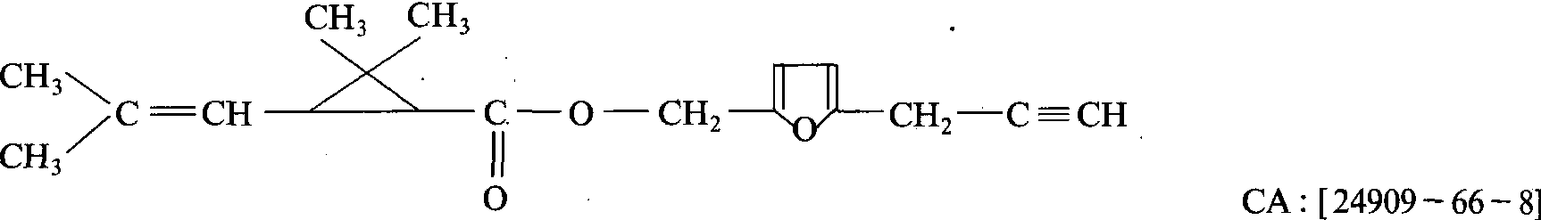 | 释义 | 炔呋菊酯d-t-furamethrin含有炔基呋喃环结构的合成拟除虫菊酯,商品名为DK-5原液、Pynamin-D、forte等。有四个光学异构体,产品是生物活性较高的右旋反式异构体。化学结构式: