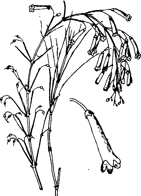 | 释义 | 炮仗竹coralplant; fountain plantRus-selia equisetiformis,别名爆竹花、吉祥草。玄参科炮仗竹属直立灌木。染色体数2n=20。高约1m。茎绿色,枝轮生,细长,具纵棱。叶小,对生或轮生,退化为披针形的鳞片。聚伞圆锥花序;花红色,花冠长筒形,长达2cm;花期春、夏季。蒴果球形。产墨西哥,中国广东、福建有栽培。喜温暖、湿润和半阴环境,耐日晒,不耐寒,越冬要求在5℃以上;宜疏松肥沃而排水良好的土壤,怕水湿。耐修剪。常用分株、扦插法繁殖,也可行压条或播种繁殖。本种红色的长筒状花朵成串着生于纤细下垂的枝条上,有如细竹上吊挂的鞭炮,环境条件适宜,可终年开花不绝。中国华南地区可在花坛和树坛边缘、假山及坡地种植,华中、华北地区宜盆栽观赏。
