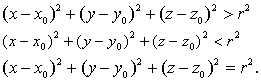 点P(x,y,z)在以P0 (x0,y0,z0)为球心,r为半径的球面的外部、内部和球面上的充要条件分别是