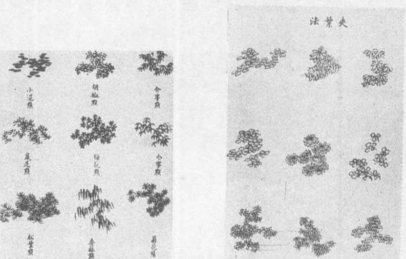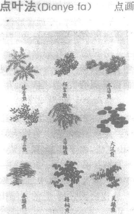 《芥子园画传》第一集 点、破笔点、杉叶点、仰叶点、垂叶点等。夹叶法亦有多种,用于填色。点叶法须相形活用。点叶法Dianye fa树叶之法。计有28种之多,如:个字点、介字点、菊花点、胡椒点、梅花点、垂藤点、小混点、鼠足点、松叶点、水藻点、大混点、尖头点、柏叶点、藻丝点、梧桐点、椿叶点、攒三点、垂头点、平头点、攒三聚五点、聚散椿叶点、仰头点、刺松点、个字间双勾点、破笔点、杉叶点、仰叶点、垂叶点等。夹叶法亦有多种,用于填色。叶法须相形活用,不必死守成法。
