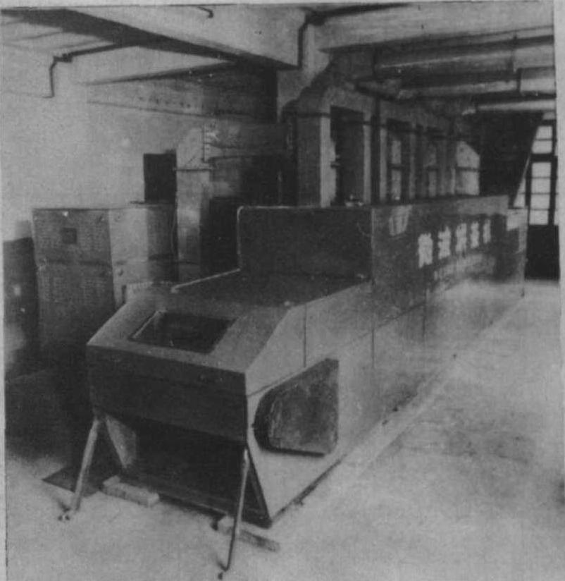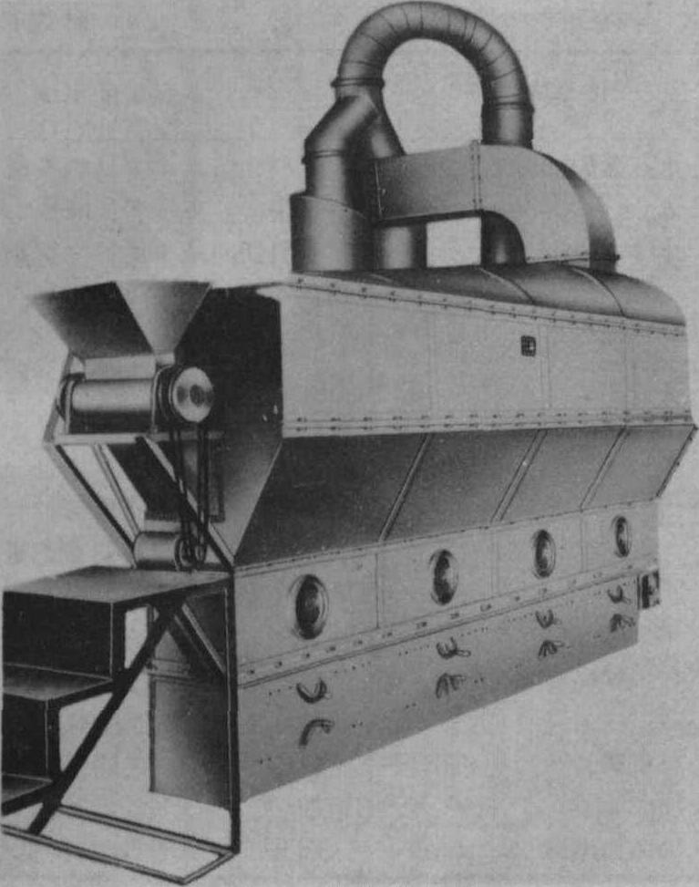 图2 沸腾烘干机 高频烘干机 茶叶作为介质放入高频可变电场中受热而干燥的一种设备。高频加热干燥茶叶, 即通过高频发生器以50赫的交流电能转变为高频振荡能量,然后馈入茶叶加热的金属板极X,使高频能量在对地回路工作极板之间产生10~20兆周的交流电能, 被加工的茶叶极性分子作振动,转变成热量,茶叶里外加热,水分蒸发, 进行干燥。 机器由高频发生器和茶叶烘干系统两部分组成。高频发生器由三台自激振荡电场8千瓦高频发生器组成; 茶叶烘干系统由茶叶烘干和传输机构组成。茶叶由输送机运送到烘干机上面的储存斗内, 经长方形的落料漏斗, 按可调的高度和宽度平面排列在传送金属带上, 向工作电容板中传动运送, 茶叶在三块工作电容极板上, 由三台高频发生器分别馈入高频波进行分段连续加热干燥。电场越强,频率越高,介质的介电常数越大, 加热效果越好(图3)。