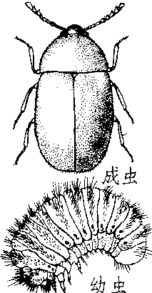 | 释义 | 烟草甲cigarette beetleLasioderma serricorne(Fabricius),昆虫纲,鞘翅目,窃蠹科。世界分布于温暖地区;中国主要分布于淮河以南。为害烟草、谷物、面粉、豆类、药材。成虫体长约3 mm,宽椭圆形,背面凸起,赤褐色,有光泽;头隐于前胸下;前胸背板半圆形,其后缘与鞘翅基部等宽。末龄幼虫体长约4 mm,淡黄色,弯弓形,体被白色细长毛;具胸足3对。中国一年发生3~6代,以末龄幼虫越冬。成虫仅饮液体,善飞翔,有假死性。卵散产在贮存烟叶皱褶或中脉处以及其他被害物的缝隙内。幼虫共5龄,喜蛀入粮粒、烟草中肋及卷烟等内部食害或在外部啮食。末龄幼虫在其被害物内部或表面作白色薄茧化蛹。可采取仓房清仓消毒、门窗装纱防止侵染、充氮降氧或药剂熏蒸等方法防治。