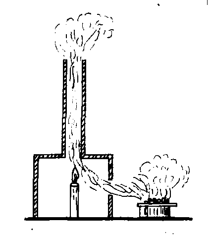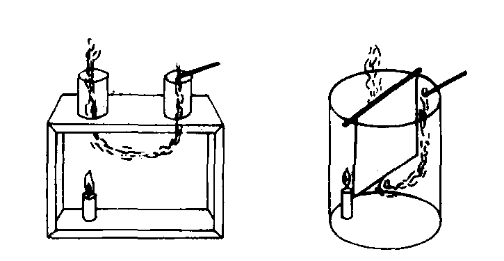 图1 图2 也可以采用图3所示的方法进行实验。在长玻璃筒的中间插一块硬纸板(不插到底),把一只点燃的短蜡烛放在玻璃筒底部的一侧,再将点燃的细香放在玻璃筒另一侧的上方,可以观察到烟从纸板的一侧进入玻璃筒,绕过纸板底部,从纸板的另一侧冒出来,显示了玻璃筒内空气的对流情况。如果将纸板抽出,玻璃筒内的空气不发生对流,过一会儿蜡烛便熄灭了。