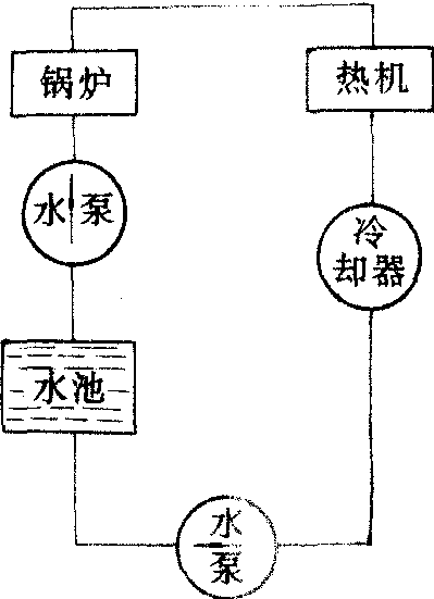 目前热机已发展成一个大家族,有各种类型的热机,成为现代工业的重要动力,在火力发电、农业机械、汽车、航海、甚至飞行中都起着举足轻重的作用。热机按工质接受热量的方式可以分为内燃机和外燃机。内燃机:燃料在热机内部燃烧,燃烧生成的气体是热机的工质。外燃机:燃料在热机外部燃烧,通过转换装置(如锅炉),将热量传递给工质(蒸汽),工质对外作功,将一部分热量转变为机械功。图中显示了外燃机的一般工作原理,水泵将水送入锅炉,水在锅炉内预热、汽化,最后变成过热蒸汽,在这个过程中工质吸收热量内能增加,过热蒸汽进入热机(蒸汽机或汽轮机)后,通过作功将一部分内能转变为机械能,随后进入冷却器,放出余热,凝结成水,再进行下一个循环。外燃机热量损失大,热效率低,但它可以使用廉价的煤作为燃料。按工质对外作功方式热机又可以分为往复式和旋转式,靠工质在汽缸内膨胀推动活塞往复运动实现对外作功的称为往复式热机,如汽油机(内燃机)、蒸汽机(外燃机);靠工质推动叶轮或转子转动实现对外作功的称为旋转式热机,如汽轮机(外燃机)、转子发动机(内燃机)。热机的分类见下表,各类型的热机性能、特点不同,各有优缺点,可根据实际工作的要求,选用适当类型的热机。