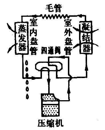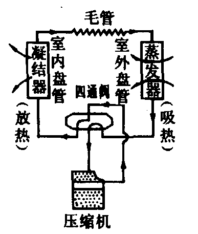 | 释义 | 热泵heat pump利用工质(如氨、氟利昂等)从低温热源吸取热量,送至高温处加以利用的设备。采暖循环、降温循环工作原理见图。吸取热量的部件是蒸发器或吸热器,释放热量的部件是冷凝器或散热器。制冷工质则通过压缩机的工作,起着从蒸发器向冷凝器输送热量的作用。采暖循环的室外盘管是蒸发器,室内盘管是凝结器。此时热泵用于采暖。通过四通阀的控制,制冷工质的流动是可逆的。降温循环,室外盘管作为凝结器,室内盘管为蒸发器。这时热泵起着冷风空调机的降温作用。降湿循环,一般用热泵降湿时,蒸发器(室内盘管)上的温度应控制在5℃左右,通过在蒸发器盘管上发生的结露现象,起到降湿作用。利用这种降湿功能时的热泵即为除湿机,这时由于蒸发器和凝结器均装在室内而不作降温用。
