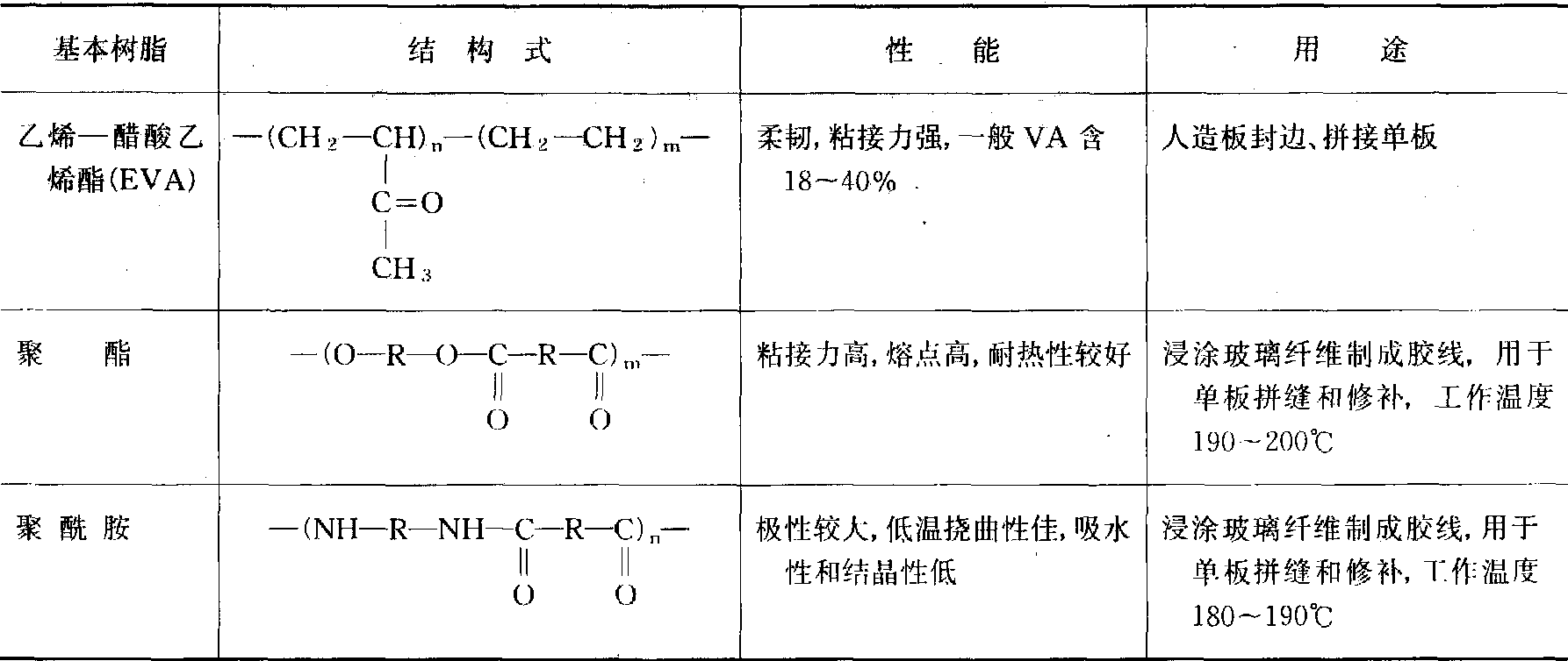 | 释义 | 热熔胶hot melt adhesives以热塑性高分子聚合物为主要成分,在室温时为固体,加热时熔融的无溶剂胶粘剂。热熔胶在熔融范围内具有流动性,冷却时根据其组分的不同而分别呈硬性或多少带有韧性的固体。在使用上热熔胶与其他胶粘剂不同之点是,当加热时熔融,移去热源时即迅速冷却变为固体,并产生很强的胶接强度。用于热熔胶的基本原料有虫胶、骨胶、皮胶、沥青、聚乙烯、无规聚丙烯、聚醋酸乙烯酯及其衍生物、乙烯—醋酸乙烯树脂、乙烯—丙烯酸乙酯树脂、聚苯乙烯及其衍生物、热塑性酚醛树脂、乙基纤维素、聚氨脂、热塑性聚酯、聚酰胺等。为了适应使用要求,热熔胶应具有耐热性、耐寒性和韧性。为此,热熔胶的组分除基本树脂外,还含有增粘树脂、增塑剂、蜡,以及少量的抗氧剂。增粘树脂的作用为降低熔点、改善操作性能和降低成本。常用的增粘树脂有松香(脂松香、木松香和浮油松香)、改性松香(氢化松香、歧化松香、聚合松香)、松香脂(聚合松香甘油脂),以及热塑性酚醛树脂。增塑剂的作用为加快熔化速度、降低熔融温度、提高柔性和耐寒性。常用的增塑剂有邻苯二甲酸二丁酯、邻苯二甲酸二辛酯和邻苯二甲酸丁苄酯。蜡的作用为降低熔融温度,改善流动性、润湿性,防止胶的结块。常用的蜡有烷烃石蜡、微晶石蜡。抗氧剂的作用为防止氧化和热分解。常用的抗氧剂有2,6-二叔丁基对甲酚和十二烷基硫代双丙烯酸脂安息香酸钠。 木材工业用的主要热熔胶