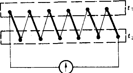 图1 热电偶示意图 用两种不同的金属或合金焊合而成的一对能产生温差电势的闭合电路。因它总是偶数或成对,所以称为热电偶。图1是它的示意图。粗线代表一种金属,细线代表另一种金属,如果f1≠f2(t1与t2为各该点上的温度), 在这个闭合电路内就有电流产生,这就是19世纪初发现的热电现象。这种现象是由于导体内的电子在热运动中获得了热能而逸出金属表面后,从热的部分传到了冷的部分,形成了电位差(也叫热电势)E,因而在闭合电路内产生了电流。E和温度变化的关系可用公式表示:E=ε(t1-t2)+γ(t2/1-t2/2)。ε和γ是系数。因为ε》γ, 在温差不大的情况下, 可简化为E=ε(t1-t2)。系数ε决定于热电偶的材料。在同样的温差条件下, 各种金属的温差电序是Bi、Co、Ni、K、Na、Hg、Pt、Al、Mg、Sn、Pb、Ag、Au、Cu、Zn、Cd、Mo、Fe。组成热电偶的两种金属导体,它们的温差电序前后位置相差愈大,热电势 的值也愈大。几种农业气象仪器上常用的热电偶,在t1-t2=1℃时产生的热电势E的数值如下表所示。![]() 有时一个热电偶的温差电势太小,需要用许多个热电偶串联起来,以增加指示器的灵敏度,如图2所示,称为热电堆。n个热电偶串联,热电势就增加了n倍。应该注意,串联热电偶时,各个热电偶的热端(包括冷端)之间要有良好的绝缘。由于热电偶增加时,热电堆的内阻也同时增加,所以灵敏度不会按n倍增加。热电偶和热电堆在测气温、地温及测太阳辐射等仪器中应用比较广泛。