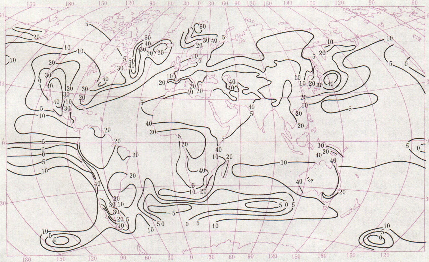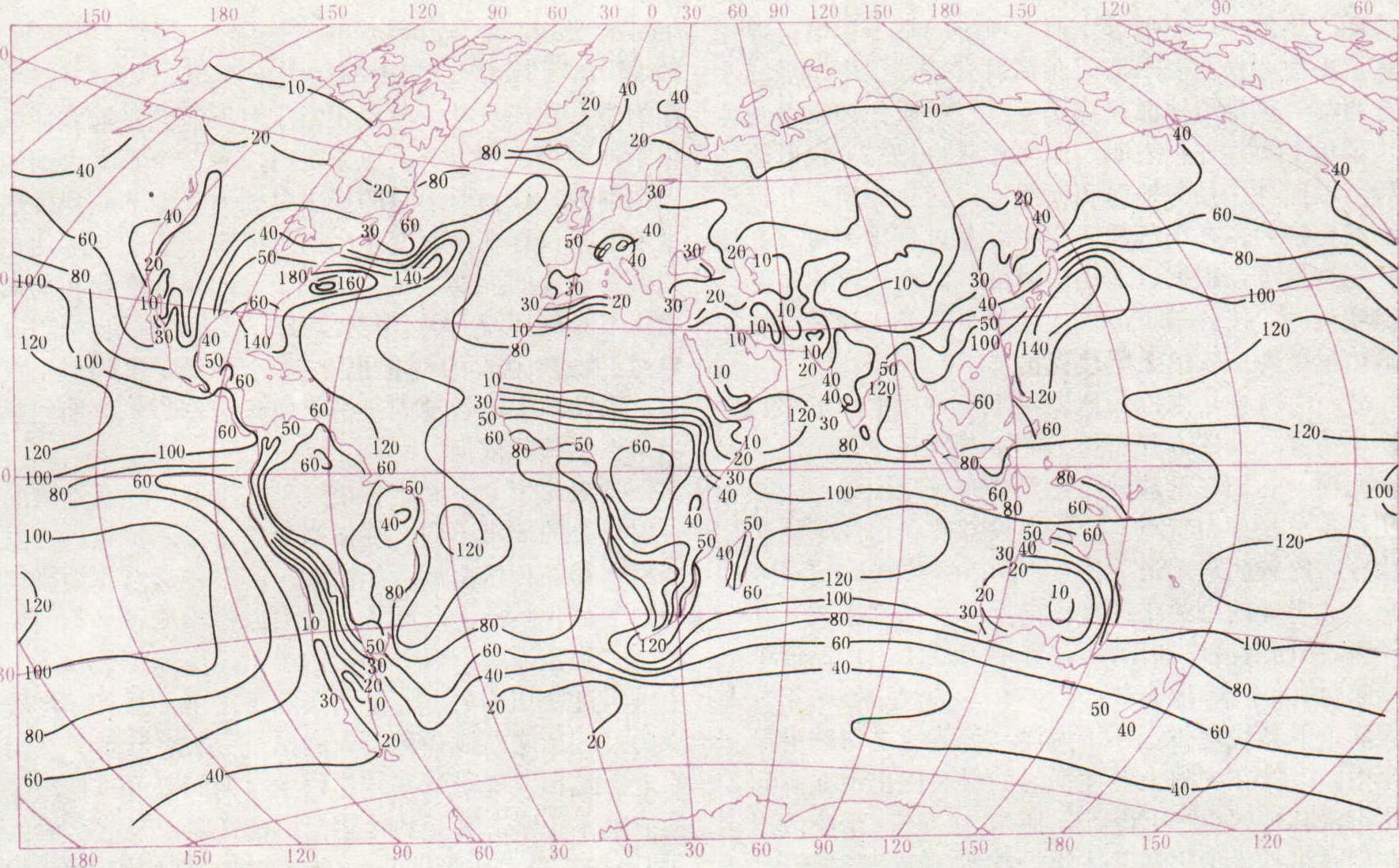 图2 湍流热交换年总量分布 (千卡·厘米-2·年-1,1卡=4.1855焦) 分布 就全年来说, 地表热平衡方程中的土中热交换项为零, 上述方程右边只剩下蒸发耗热和湍流热交换两项。它们在全球的年总量分布可见图1、2。蒸发耗热年总量分布特点有: ❶蒸发耗热在海洋上纬向带状分布比较明显, 最大值(大于120千卡/厘米2·年)在南、北半球的副热带纬度, 向中、高纬度递减。在暖洋流(墨西哥湾流和黑潮)流经的海域, 出现高值中心 (超过160千卡/厘米2·年和140千卡/厘米2·年); ❷大陆上的蒸发耗热远小于海洋, 等值线在海陆沿岸发生中断; ❸在大陆上蒸发耗热的最大值出现在湿润的热带雨林地区(大于60千卡/厘米2·年), 最小值出现在副热带沙漠地区和北冰洋沿岸地区(小于10千卡/厘米2·年)。湍流热交换年总量的分布则相反, 但其等值线在海陆沿岸也不连续;在暖洋流地区数值较大,以及在北冰洋沿岸数值很小等, 则与蒸发耗热年总量是一致的。全球的净辐射(见辐射平衡)、蒸发耗热和湍流热交换的年总量, 如表。М.И.布德科根据各地水、热平衡状况特点, 提出以R/Lr(r为年降水量,L为汽化潜热)作为气候干燥度指数,能较好地揭示各种气候类型的主要特点, 并在此基础上提出了气候分类法。 全球净辐射(R)、蒸发耗热(LE)和湍流热交换年总量(P)(kJ·cm-2·a-1)