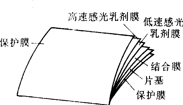 | 释义 | 照相底片zhaoxiang dipian涂有感光乳剂的玻璃板或透明有机薄片。又叫感光片或负片。能记录光学信息,并利用物理或化学方法将信息固定、放大和贮存起来。感光乳剂是主要工作部分,根据其化学成分,有银盐和非银盐两类。目前广泛使用的是银盐类,其底片大约有六层(如图)。感光乳剂膜由卤化银、动物胶和色素组成。受光时,卤化银微粒晶体吸收光子,有很少量卤化银还原为银原子,形成肉眼看不见的潜像。将已感光的照相底片浸在含有有机还原剂(常用的是氢醌和米吐尔)的显影液中,使已还原的银原子周围的卤化银也还原为银原子,形成银微粒,呈现黑色;接受光能量越多的部位,形成的银微粒越多,显得越黑,这就是底片上的黑影。再将底片放入含有硫代硫酸钠的定影液中,将乳剂中未还原的卤化银溶去,使影像稳定下来,底片就制成了。如果在显影后不经定影,将负像溶解,再让未还原的卤化银感光,显影后,直接得到正像,这一过程叫黑白反转冲洗。银盐只能感受蓝、紫色光,在乳剂中加入红色色素后,可对黄、绿色感光,这是分色片;若再加入绿色色素,就成为对所有光线都能感光的全色片(即黑白片)。彩色照相底片的感光乳剂有三层,顶层只对蓝光感光,中间层只对绿光感光,底层只对红光感光。每层之间有隔层,防止加工时染料串层。这样,一次曝光就能将拍摄对象的颜色分别记录下来。