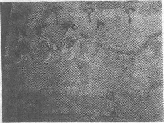 | 释义 | 燕居行乐图壁画十六国·北凉。甘肃省酒泉市丁家闸5号墓前室壁画。1977年发掘。燕居行乐图是全墓壁画中最精彩的部分。画面右侧绘一朱屋,青瓦、正脊、单檐、无墙。墓主人头戴三梁进贤冠,身着交领长袍,手持尘尾,端坐于椅上观赏歌舞。身后立男女侍从,侍女手持方形曲柄华盖,男侍双手捧一物。画面中部绘一方案,上置樽、勺,案下有温酒器,案旁立男侍。画面左侧为宴乐场面。在乐伎伴奏下,一舞伎双手各持一便面,双脚跨开,回旋而舞。另一舞伎作曲腿造型,应拍击掌,回首且歌且舞。舞伎的一侧为乐伎,第一位戴帻男乐伎,手抚箜篌,其身后的三位均为女乐伎,头挽三髻,身着长裙,分别奏琵琶、吹箫、拍腰鼓。伎乐的下方为百戏,在铺席的地上,两位女伎双手撑地倒立,腰肢十分柔软。整个画面布局合理,疏密相间,人物神情的刻划,衣纹、身姿的描绘都较东汉有了长足的进步。画面以墨线勾描为主,运笔粗细多变,弧线流畅,直线浑厚,在一些主要部位又用朱砂、石绿、石黄等色,使画面色彩不觉单调,可称为十六国时期墓室壁画的代表作。