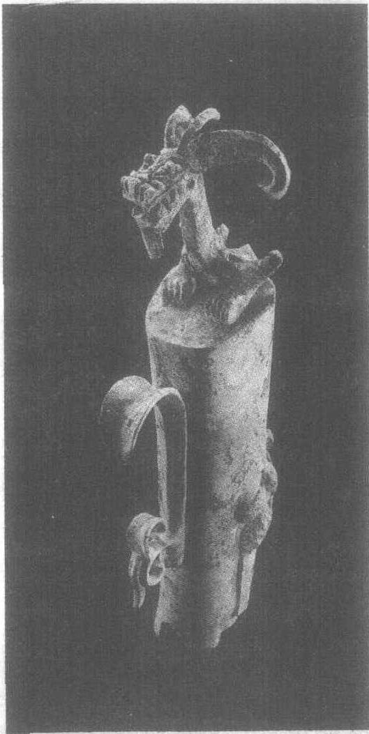 | 释义 | 爬龙铜柱形器商。通高40.5厘米。1986年四川省广汉三星堆1号祭坑出土。四川省文物管理委员会藏。器为圆柱形,下端有四个半圆形缺口,上端平坦,有一伏龙。龙头的长角似羊角,瞠目,张口,昂首,面目狰狞。龙身垂于柱壁,尾部上卷,后爪攀紧柱身。整件器物造型夸张,艺术概括力强,具有独特风格。它可能是某种器物的附件。
