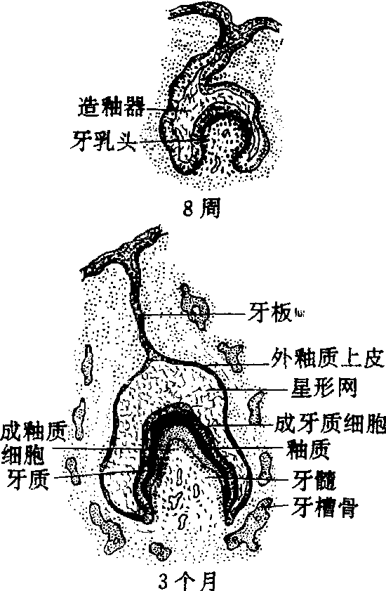| 释义 | 牙的发生人胚第7周时,上、下颌表面上皮细胞增生,形成沿上、下颌形状的“U”形牙板,伸入深部间充质内(见图2.4-7)。牙板向唇的一面,以一定间隔,几乎同时形成10个圆形突起,称造釉器,这就是乳牙原基。造釉器发育增大,底部凹陷成为帽状。帽的凹窝内有间充质伸入,称牙乳头。造釉器发育为牙的釉质,牙乳头分化为牙本质和牙髓,造釉器外围的间充质分化为牙骨质和牙周膜。胚胎后期,牙板与造釉器相连的部分退化消失。牙釉质和牙本质都从牙冠顶部开始形成,然后向牙根扩展。在牙根开始生长之前整个牙冠早已形成。牙根的增长是出牙的一个重要原因,因为牙根的增长将牙冠推出牙龈,在牙冠开始露出时,牙根还没有完全长成,直到牙冠完全露出后,牙根才充分生长。乳牙在婴儿1—3岁时生长完成,7—11岁又陆续脱落。胎儿第3个月时牙板的舌面上开始形成恒牙原基,在乳牙的舌面,对应地产生10个恒牙原基,其他恒牙原基由牙板向后延伸的部分产生,但发生的时间不同。第二、第三恒磨牙的原基分别在出生后第4、第5年出现,其余仍在胎儿时期发生。恒牙的体积较小,分化发育也较晚。恒牙的形成过程与乳牙相同。恒牙发生后一直处在停止生长的状态。在牙板消失后,恒牙原基便位于乳牙舌侧的牙槽陷窝内。到儿童6岁时,颌骨体积接近成人颌骨大小,恒牙才开始生长,从而推挤相应乳牙的下方,促使乳牙脱落。当恒牙生长时,上位乳牙的根便被破骨细胞吸收掉,于是恒牙便位于乳牙剩余部的下方。最后,整个乳牙根部几乎完全毁损,松动的冠部脱落,恒牙便有了出牙的位置。