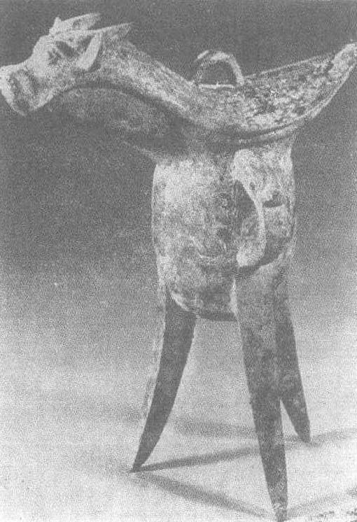 | 释义 | 牛头铜角商。饮酒器。通高23厘米,腹深10.5厘米,足高10.2厘米,流长7.8厘米,流宽3.6厘米。重1.11公斤。1952年河南省新乡市博物馆征集。此角深腹,圆底,锥足,无柱。盖为牛头形,中间有一半圆形钮。正中有一矮脊,上饰四条夔纹,中填雷纹。腹部有三扉棱,以扉为鼻组成两组饕餮,雷纹相间。盖内有铭文: “妇