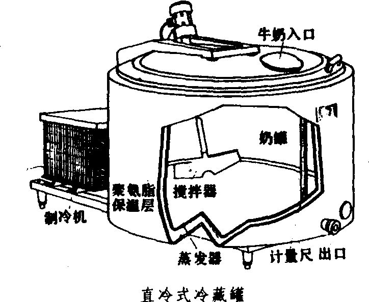 浸入式冷却器 适用于中、小型奶牛场。它由制冷机、一个带搅拌器的蒸发器和带保温层的贮奶罐组成。蒸发器内通制冷剂(氟里昂),只要将蒸发器插入贮奶罐即可冷却牛奶。其工作过程是:搅拌器旋转时,底部牛奶被吸入,逐渐从蒸发器上方溢出形成循环,牛奶在与蒸发器接触过程中逐渐冷却,达到指定温度后,取出浸入式冷却器,另用盖子将奶罐盖严。贮奶罐内壁由不锈钢制成,其夹层内充填聚氨脂发泡塑料,用以保温。 牛奶经冷却器冷却后需另配备冷库来冷藏,所需设备多、占地面积大、使用也不方便。20世纪80年代以来使用冷藏罐的日益增多。冷藏罐可单独使用,也可与片式冷却器联合使用,即用冷水作载冷剂,通过片式冷却器将牛奶预冷后再送入冷藏罐,以加快冷却速度,节省电耗。 有些国家在冷藏罐外安装一套热量回收装量,利用牛奶在冷却过程中释放的热量,将水加热到60℃,供挤奶间清洗管路用。这是一项节能新技术,它只需在冷藏罐的制冷机上增加一套换热器和保温贮水罐。其工作过程是:液体制冷剂从贮液罐进入冷藏罐吸收牛奶热量后变成气体,经气液分离器进入压缩机,形成高温、高压气体(氟里昂-22可达150℃)后再进入新增加的换热器中与水进行热交换,水被加热后贮存在保温贮水罐中。此时制冷剂被冷凝成液体回到贮液器重新进行循环。 牛奶冷却设备milk colling equipment用来冷却刚挤出的牛奶以防牛奶因温度较高而变质的装置。有直接冷却式和间接冷却式两类。前者是将刚挤出的牛奶直接送往冷却罐冷却;后者是将刚挤出的牛奶先储放在容器内,待装满一定量后再送往冷却器冷却。直冷式由奶罐及制冷设备等组成,能自动循环冷却牛奶的温度,(从30℃左右冷却到4~5℃),当罐内牛奶温度降到规定值后,制冷机便停止工作,温度超过规定值,机组又自行起动开始循环工作。间接冷却的方法很多,最简单的方法是将奶桶放入冷水或冰水的水池中,但冷却缓慢,劳动强度大。也可采用冷却器冷却。按结构型式,有圆筒式和管式两种;后者又有单排与双排之分。按冷却剂与牛奶在设备中的相对位置不同,可分为水管式冷却器(牛奶的热量向管内传递)和奶管冷却器(牛奶的热量向管外传递)两种。奶管式冷却器卫生条件好,脏物和细菌不易进入牛奶,并可避免牛奶与空气接触。 |