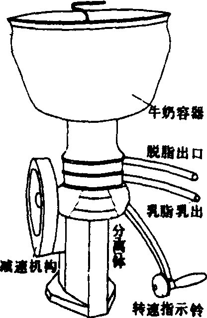 图2 分离钵的工作过程 牛奶在分离前必须过滤并预热到35~40℃,以降低牛奶粘度,增大乳脂与脱脂乳之间的比重差,提高分离效率。但温度过高会使部分蛋白质变性凝固,反而增加牛奶粘度,影响分离。手摇牛奶分离机的摇把上装有转速指示铃。未达额定转速时,每摇一圈会有一声铃响,以免转速过低影响分离质量。 |