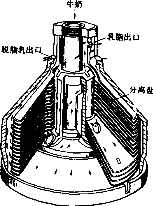 图1 牛奶分离机 分离钵的工作过程(图2)是:牛奶从中央管进入,经盘托沿各分离盘小孔上升,在分离盘之间形成薄层。分离钵高速旋转,使牛奶获得很大的离心力,转速愈高脱脂乳与乳脂离心力的差异也愈大。脱脂乳被甩向分离钵外圈,经上分离盘与分离钵盖之间的空隙,从脱脂乳排出口排出。乳脂则向着与离心力相反的方向“上浮”,在盘托周围集中、上升,从乳脂排出口排出。在乳脂排出口处有调节螺钉,拧入螺钉,使出口处的断面减小,乳脂流出量减少,浓度增加。乳脂与脱脂乳容积比的调节范围规定为1:3~12。