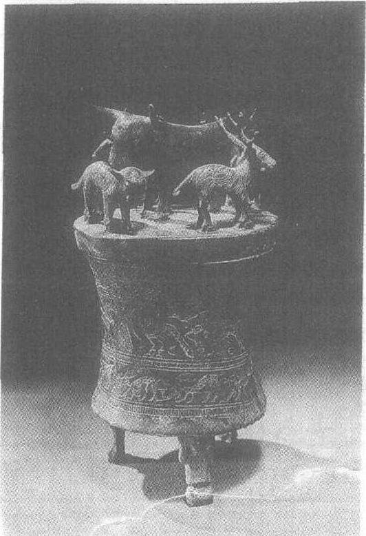 | 释义 | 牛虎鹿铜贮贝器战国。古代滇族统治者贮存贝币的用具。通高34.5厘米。云南省江川李家山出土。云南省博物馆藏。器作束腰圆筒形,底有三足,均为跪坐人形双手托器状。盖顶中部焊立一牛,体形较大,周环一虎三鹿,五兽神态温顺。虎、鹿及器身均刻有纹饰。器身除三角齿纹、绳纹外主要为鸟、鹿纹,羽人趋牛图等。李家山出土青铜器多以牛、马等畜为装饰题材,反映了当时以农业为主的滇族社会畜牧经济仍占有很大的比重。