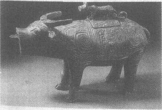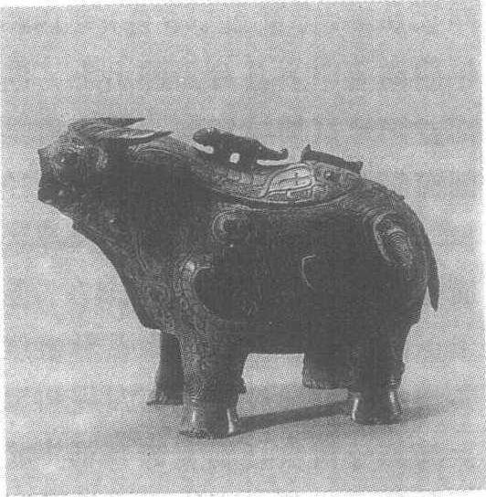 牛铜尊西周。通高24厘米,长38厘米,腹深10.7厘米。重6.9公斤。1967年陕西省岐山贺家村出土。陕西省博物馆藏。尊,古代盛酒器。此尊作水牛形。背上开方口置盖,系环与器身连接,盖上立一虎为钮,虎身微向后缩。牛口部有流,尾卷成环鋬。短粗的四腿,增加了尊的稳重感。通体饰目形的窃曲纹及卷蜗形花纹。纹饰简洁,流畅,造型生动,新颖实用,比例匀称,较商代晚期和西周初期神秘诡奇的鸟兽尊有了新的发展。这是一件西周中期青铜器中出类拔萃的艺术珍品,充分反映了两千八百多年前我国劳动人民的聪明才智,以及青铜冶铸、工艺美术等方面所达到的高度水平。