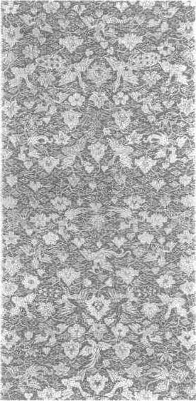 明代织锦摹写复原图,图案为缠枝牡丹,花朵端庄饱满,叶茎温柔婉转,二者相反相成,既使主题突出,又令各自的形象特点更加醒目。主花色彩或浓重强烈,或明艳秀丽,而沉稳的藏青色地既令它们争芳斗妍,各擅其美,又使之和谐统 一。这是古代织锦中难得的杰作。