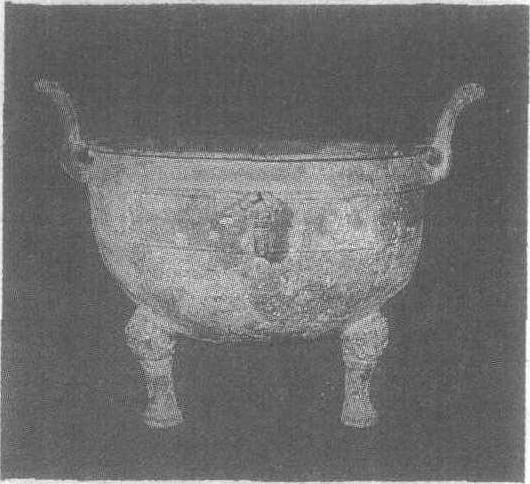 春秋。炊器,礼器。高59厘米,口径55厘米。传为河南省新郑盗掘出土。台北历史博物馆藏。圆形,深腹,薄唇,附耳外翻,腹下有三兽腿形足。颈体蟠螭纹、鳞纹和三角形、渦纹,腹饰蟠螭纹、蟠夔纹,颈及腹部有凸绳纹。腹前后有三角形鼻状饰物。此鼎为春秋中期遗物。
