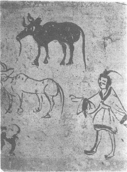 西晋。甘肃省嘉峪关市1号墓前室西壁砖壁画。图中有羊群,另有几只牛悠然相随,一穿交领衫的牧民手持鞭子紧跟于后。他双腿分立,扬臂举鞭,正在驱赶着牧群。右下角有朱色“牧畜”二字题识。此画展现了戈壁草滩上的牧畜情景,反映出当时的牧民的豪放生活。