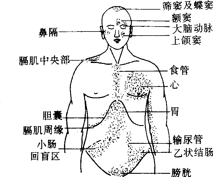 | 释义 | 牵涉痛内脏疾病时常常引起身体体表部位发生疼痛或痛觉过敏的现象称为牵涉痛,有时病变脏器本身并无明显的疼痛,这时牵涉痛就有重要的意义,可提示病人去寻找真正的疾病。例如,心肌缺血时,可出现心前区及左臂内侧的疼痛;胆囊病变时,右肩出现疼痛;阑尾炎时,常常感觉上腹部或脐部疼痛等(见图1.12-6)。解剖学的研究证明,发生牵涉痛的皮肤部位与真正患病的内脏部位是有一定的解剖关系的,即它们的传入神经纤维是进入同一脊髓节的,而且在进一步向上传递时,使用共同的神经元或非常邻近的神经元。由于在日常生活中,经常能意识到的是来自皮肤,因而,虽然痛觉传入冲动来自于内脏,但大脑皮层的意识中认为来自于皮肤。为什么发生牵涉痛的皮肤区域有些距相应内脏较远?胚胎发生的研究解释了这一问题,即传入神经纤维进入同一脊髓节的内脏与皮肤区域,在胚胎初期时是相距很近的,但在胚胎的进一步发育时,内脏发生了移位,可以与同一脊髓节支配的区域有较大的距离;形成了牵涉痛皮肤区域与患病器官位置上的差距。