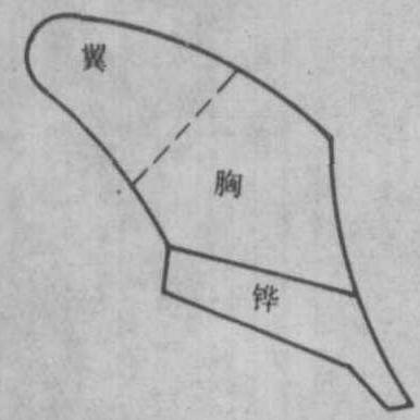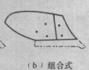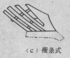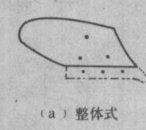 图2 犁铧 犁壁 犁体用来翻土碎土的部件。犁壁和犁铧在犁体上本应是一个整体以完成犁体切土、翻土、碎土的功能。但由于犁体下部切土受力较大,磨损较快,而其上部切土受力小,磨损较慢,故将其分成两部分,上部为犁壁,下部为犁铧,以便磨损后分别更换。犁壁的形式有三种(图3):❶整体式。由优质钢料压制而成。大多数犁体的犁壁属此类。也有用面层很硬、心层较软的三层钢板压制的。 ❷组合式。将犁壁的前部和后部制成两件组合起来,以便将磨损较快的前部单独更换。 ❸栅条式。由几条钢制板条排列成栅栏状,这种犁壁在湿软土地上不易粘附泥土,脱土性好,适宜耕潮湿地和水稻田。