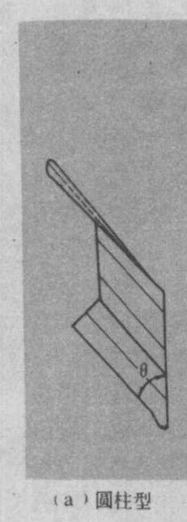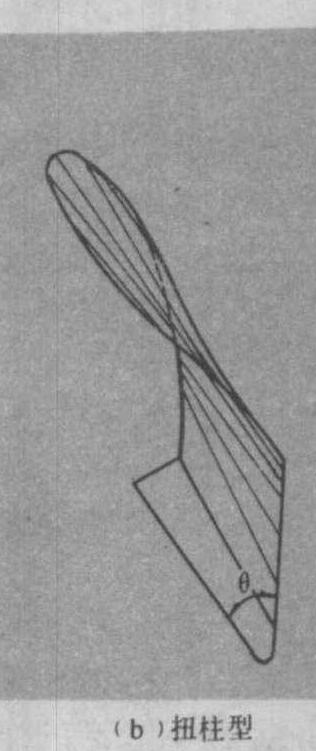 图4 犁托 犁体曲面 由犁铧和犁壁的表面构成,亦称犁面,是犁的工作面。它直接反映犁的碎土、翻土、覆盖以及地表平整度等工作性能。滚垡型犁体曲面各部位的名称如图5。犁体曲面按其几何形状分为圆柱形[图6(a)]、扭柱形[图6(b)]、螺旋形[图6(c)]、单叶双曲面型(图7)等多种。不同几何形状的犁体曲面由于其构成原理和弯曲程度不同,其功能亦有很大差别。如胸部较陡,翼部较短且扭曲较小的圆柱型犁体曲面,碎土性能好,但翻土和覆盖性能较差,适用于耕沙壤土和地表杂草较少的熟土;胸部上升较平缓,翼部较长且扭曲较大的扭柱型犁体曲面,碎土性能差,但翻土性能较好。适用于耕茬地、潮湿地、粘土地;犁面翼部扭曲很大,整个曲面近似螺旋面的螺旋型犁体曲面,用于耕翻牧草地,开垦荒地,覆盖严实,阻力较小。对于高速作业,还设计有铧刃角θ较小,翼部后掠较大的犁体曲面。犁体曲面可由一组或两组直线(称为直元线)按一定的规律运动而形成。也可用曲元线组成。