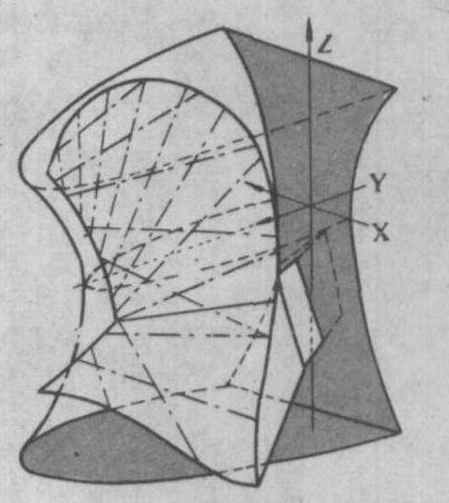 图7 单叶双曲面型犁体曲面 犁体plow body,plow bottom又称犁头。铧式犁的主要工作部件。由犁铧、犁壁、犁侧板、犁托和犁柱等组成。犁铧和犁壁构成犁体曲面,以实现切土、翻土和碎土;犁侧板用以支持犁体并承受犁体工作时所产生的土壤侧压力;犁托和犁柱用以固定犁铧、犁壁和犁侧板并与犁架相连接。犁体曲面对犁的翻土、碎土性能起决定作用。根据犁体曲面的形式和翻转土垡的特点,犁体有滚垡型、窜垡型和滚窜型三大类。滚垡型又称翻垡型,以滚动翻转土垡为主,覆盖性能较好,有一定的碎土能力。根据犁体翻土和碎土作用的大小,滚垡型又可分为圆柱型、熟地型、半螺旋型和螺旋型4种。窜垡型犁体是中国传统犁的工作曲面,以窜垡落垡、腾空翻转土垡,土垡的断条架空性能较好,有利于水田土壤的冬耕晒垡。滚窜型犁体又称通用型,是综合前两类犁体曲面特点而成的一种滚、窜结合的犁体曲面,它有较好的翻垡性和碎土性,适于水田土壤的旱耕和水耕。此外,犁体还有根据耕地深度、犁壁结构形式等特征来进行分类的。 |