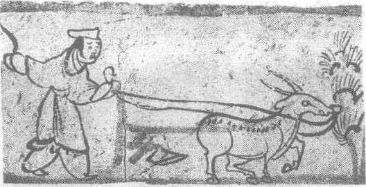 | 释义 | 犁地图砖画西晋。纵17厘米,横36厘米。甘肃省嘉峪关新城6号墓前室西壁砖画。图中绘一农夫驾牛犁地。而耕牛忽然发现了田边的一株灌木,凑过头去准备品尝一下枝叶的滋味。农夫长襦裈裤,一只手扶犁、牵缰绳,另一只手挥着鞭子要将耕牛赶起来继续耕作,表情显得有些不耐烦。二者构成了一幅有趣的画面,也是现实生活的真实写照。完全没有墓室中那种肃穆的气氛。