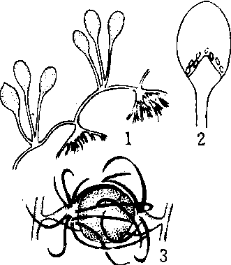 犁头霉属 1.孢子囊、孢囊梗、匍匐细菌丝、假根 2. 孢子囊和囊轴 3. 接合孢子 |