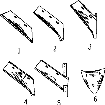 犁铧 1.梯形铧 2.凿形铧 3.带侧舷铧 4.组合铧 5.可伸凿尖铧 6. 三角形铧 |