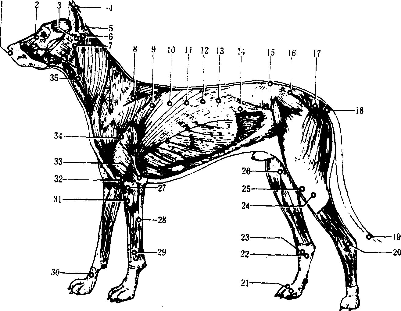 图1 犬的肌肉及穴位 灵台(lingtai) 位于第六、七胸椎棘突间的凹陷正中, 一穴。用毫针稍向后下方斜刺1~3厘米, 或艾灸。主治胃痛、支气管炎、腰痛、发育不良、体质虚弱。 中枢(zhongshu) 位于第十、十一胸椎棘突间凹陷正中, 一穴。毫针直刺1~2厘米, 或艾灸。主治食欲不振、胃炎。 脊中(jizhong) 位于第十一与第十二胸椎棘突间凹陷正中, 一穴。毫针稍向后方刺入0.5~1厘米, 或艾灸。主治少食、消化不良、腹泻。 悬枢(xuanshu) 位于第十三胸椎和第一腰椎棘突间凹陷正中,一穴。毫针向后下方斜刺1~2厘米,或艾灸。主治腰风湿、腰部扭伤、消化不良、肠炎、腹泻。 命门(mingmen) 又名肾门, 位于第二、三腰椎棘突间凹陷正中,一穴。毫针向后下方斜刺1~2厘米,或艾灸。主治泌尿系统障碍、食欲减少、风湿病、腰部扭伤、慢性肠炎, 肾炎、阳痿。 阳关(yangguan) 位于第四、五腰椎棘突间凹陷正中, 一穴。毫针向后下方斜刺1~2厘米。主治性功能减退、子宫内膜炎、卵巢囊肿、子宫卵巢萎缩、情期延长、腰风湿、腰部扭伤。 关后(guanhou) 位于第五、六腰椎棘突间凹陷正中, 一穴。毫针直刺1~2厘米, 或艾灸。主治子宫内膜炎、卵巢囊肿、膀胱炎、大肠麻痹、便秘。 百会(baihui) 位于最后腰椎棘突与荐椎间凹陷正中, 一穴。以毫针直刺入1~1.5厘米。主治坐骨神经痛、后躯瘫痪、腰胯风湿、直肠脱。 尾根 (weigen) 位于最后荐椎与第一尾椎棘突间凹陷处, 一穴。以毫针直刺0.5~1厘米。主治坐骨神经痛、后躯瘫痪、尾麻痹、脱肛、便秘或腹泻。 尾节(weijie) 位于第一、二尾椎间凹陷正中,一穴。毫针直刺0.5~0.8厘米, 或艾灸。主治后躯瘫痪、尾麻痹、脱肛、便秘或腹泻。 尾干(weigan) 位于第二、三尾椎间凹陷正中,一穴。毫针直刺0.5~0.8厘米,或艾灸。主治后躯瘫痪、尾麻痹、脱肛、便秘或腹泻。 尾尖(weijian) 位于尾部末端, 一穴。以毫针或圆利针从末端直刺0.5~0.8厘米。主治中风、中暑、胃肠炎。 二眼(eryan) 位于荐部两侧、距背正中线约3厘米的第一、第二背荐孔中, 左右侧各二穴。毫针直刺1~1.5厘米,或艾灸。主治后躯瘫痪、腰胯神经痛、腰胯风湿、子宫疾病。 尾本(weiben) 位于尾根腹侧正中的尾静脉上,一穴。毫针直刺0.5~1厘米。出血。主治腹痛、尾神经麻痹、腰部风湿、中暑、肠炎。 后海(houhai) 又称交巢, 位于尾根与肛门之间的凹陷正中,一穴。毫针直刺1~3厘米。主治腹泻、便秘、直肠麻痹、肛门括约肌麻痹、阳痿。 肺俞(feishu) 位于胸背部, 倒数第十肋间, 距背中线约6厘米凹陷处,左右侧各一穴。毫针沿肋间向下斜刺1~2厘米,或艾灸。主治肺炎、支气管炎。 厥阴俞(jueyinshu) 位于胸背部,倒数第九肋间,距背中线约6厘米处,左右侧各一穴。操作同肺俞。主治心脏病、呕吐、咳嗽、癫痫。 心俞(xinshu) 位于胸背部,倒数第八肋间,距背中线约6厘米处,左右侧各一穴。操作同肺俞。主治心脏病、癫痫。 督俞(dushu) 位于胸背部,倒数第七肋间,距背中线约6厘米处,左右侧各一穴。操作同肺俞。主治心脏病、腹痛、膈肌痉挛。 膈俞(geshu) 位于胸背部,倒数第六肋间,距背中线约6厘米,左右侧各一穴。以毫针沿肋间向下斜刺1~2厘米,主治慢性出血性疾病、膈肌痉挛。