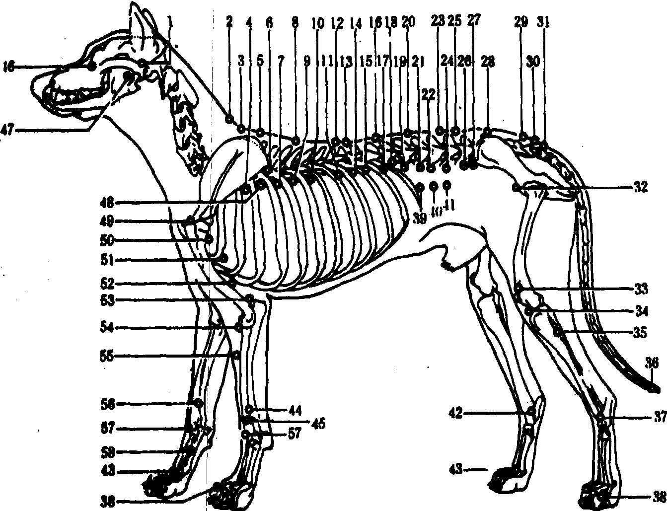 图2 犬骨骼及穴位 肝俞(ganshu) 位于胸背部、倒数第四肋间,距背中线约6厘米,左右侧各一穴。操作同肺俞。主治黄疽、眼病。 胆俞(danshu) 位于胸背部,倒数第三肋间,距背中线约6厘米,左右侧各一穴。操作同膈俞。主治黄疽、眼病。 脾俞(pishu) 位于胸背部,倒数第二肋间,距背中线6厘米处,左右侧各一穴。操作同膈俞,或艾灸。主治食欲不振,消化不良,呕吐、贫血以及慢性腹泻。 胃俞(weishu) 位于胸背部,倒数第一肋间, 距背中线约6厘米处,左右侧各一穴。用毫针直刺1~3厘米,或艾灸。主治食欲不振、消化不良、呕吐、慢性腹泻、贫血。 三焦俞(sanjiaoshu) 位于腰部,第一腰椎横突游离端相对的髂肋肌沟中,左右侧各一穴。操作同胃俞。主治食欲不振、消化不良、呕吐、贫血以及慢性腹泻。 肾俞(shenshu) 位于腰部,第二腰椎横突游离端相对的髂肋肌沟中,左右侧各一穴。操作同胃俞。主治肾炎、多尿症、不孕症、阳痿、腰风湿、腰扭伤。 气海俞(qihaishu)位于腰部,第三腰椎横突游离端相对的髂肋肌沟中,左右侧各一穴。操作同胃俞。主治便秘、气胀。 大肠俞(dachangshu)位于腰后部,第四腰椎横突游离端相对的髂肋肌沟中,左右侧各一穴。操作同胃俞。主治消化不良、肠炎、便秘。 关元俞(guanyuanshu)位于腰后部,第五腰椎横突游离端相对的髂肋肌沟中,左右侧各一穴。操作同胃俞。主治消化不良、便秘、腹泻。 小肠俞(xiaochang.shu) 位于腰后部,第六腰椎横突游离端相对的髂肋肌沟中,左右侧各一穴。毫针向内下方斜刺1~2厘米,或艾灸。主治肠炎、腹泻、肠痉挛、腰荐痛。 膀胱俞(pangguangshu) 位于腰后部,第七腰椎横突游离端的髂肋肌沟中,左右侧各一穴。操作同小肠俞。主治膀胱类、血尿、膀胱痉挛、尿液潴留、腰荐痛。 胰俞(yishu) 位于第二腰椎横突游离端下方约3厘米处,左右侧各一穴。操作同小肠俞。主治胰腺炎、消化不良、慢性腹泻、多尿症。 卵巢俞(luanchaoshu) 位于第四腰椎横突游离端后缘的下方约3厘米处,左右侧各一穴。毫针向内下方斜刺1.5~2厘米, 主治性腺功能减退、卵巢激素功能不会、卵巢炎、卵巢囊肿、不孕症。 子宫俞(zigongshu) 位于第五腰椎横突游离端后缘的下方约3厘米处,左右侧各一穴。用毫针直刺1~3厘米。主治卵巢囊肿、子宫内膜炎、子宫功能障碍、腰部风湿。 天枢(tianshu) 位于腹下脐眼旁开3厘米, 左右侧各一穴。毫针直刺0.5厘米。主治肠痉挛、肠炎、腹泻、便秘、子宫内膜炎。 中脘(zhongwan) 位于腹下正中线,剑状软骨与脐眼之间的中点处, 一穴。毫针向前上方斜刺0.5~1厘米, 或艾灸。主治急性胃炎、胃痉挛、胃出血、胃痛、胃扩张、呕吐、消化不良、厌食。 膏肓俞(gaohuangshu) 位于肩胛骨后角内侧缘,左右侧各一穴。毫针斜刺2~4厘米; 或艾灸。主治肩扭伤、肩胛神经麻痹、肩风湿、支气管炎、贫血、久病体弱。 胸 堂 (xiongtang) 位于胸外侧臂三头肌与臂头肌间的臂头静脉上,左右侧各一穴。抬高头部、两前肢站齐,以三棱针顺血管急刺1厘米, 出血。主治中暑、肩肘扭伤、风湿症。 弓子(gongzi) 位于肩胛软骨当中, 前下方冈结节腹侧, 左右肢各一穴。毫针顺肩胛冈向前下方斜刺1.5~3厘米。主治肩胛扭伤、肩胛神经麻痹、肩胛风湿。 肩井(jianjing) 位于肩峰前下方, 肩关节外上缘凹陷处, 左右侧各一穴。毫针向内下方刺入1~3厘米。主治前肢和肩部神经痛或麻痹、肩部扭伤、肩关节炎、前肢风湿。 肩外顒(jianwaiyu) 位于肩关节后缘,臂骨大结节嵴后上方凹陷处,左右侧各一穴。毫针直刺2~3厘米。主治肩胛扭伤、肩胛神经麻痹、前肢神经痛、前肢风湿。 抢风(qiangfeng) 位于肩关节后方,三角肌后缘、臂三头肌长头和外头之间的方形孔正中。左右侧各一穴。毫针直刺2~4厘米。主治肩关节炎、肘关节扭伤、前肢麻木、前肢风湿。 郗上(xishang) 位于臂骨下四分之一处的后缘凹陷正中,左右肢各一穴。毫针直刺2~4厘米。主治前肢扭伤、前肢神经痛或麻痹。 肘俞(zhoushu) 位于臂骨外上髁与肘突间凹陷中, 左右肢各一穴。毫针直刺2~4厘米。主治前肢扭伤、前肢神经痛或麻痹、肘关节炎、肘部风湿。 四渎(sidu) 位于臂骨外髁与桡骨小头间前方凹陷中,左右肢各一穴。毫针直刺2~4厘米,或艾灸。主治前肢扭伤, 前肢神经痛、神经麻痹。 三阳络(sanyangluo) 位于前臂外侧上三分之一与中三分之一交界处的桡骨后缘, 左右肢各一穴。毫针向内侧斜刺1.5~3厘米, 主治臂部疼痛。为针刺麻醉常用穴。 前三里(qiansanli) 位于前臂外侧上四分之一处,桡骨头下方的腕桡侧肌和指总伸肌间隙内, 左右肢各一穴。毫针直刺2~4厘米, 或艾灸。主治桡、尺神经麻痹、前肢神经痛或风湿痛。 外关(waiguan) 位于前臂外侧下四分之一处,桡骨与尺骨的间隙中, 左右肢各一穴。毫针直刺1~2厘米, 或艾灸。主治桡尺神经麻痹、前肢神经痛、风湿、便秘、乳汁分泌不足、腕关节扭伤、屈腱炎。 内关(neiguan) 位于前臂内侧, 桡骨、尺骨间隙的下四分之一处, 与外关相对, 左右肢各一穴。毫针直刺1~2厘米; 或艾灸。主治前肢神经麻痹、前肢扭伤、胃肠痉挛、急腹症、呕吐、心脏疾患、中风。 阳辅(yangfu) 位于前臂部远端背侧正中, 阳池穴上方2厘米,左右肢各一穴。毫针直刺0.5~1厘米,或艾灸。主治前肢神经麻痹、腕腱扭伤。 阳池(yangchi) 位于腕关节背侧,腕骨与桡骨远端连接处的凹陷中, 左右肢各一穴。毫针直刺